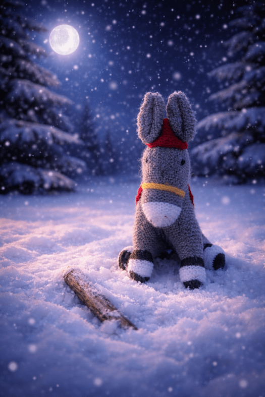 Dizzy lived in a quiet, snowy place where the nights grew long at Christmas, and the stars felt very close to the ground. She was a kind donkey, though sometimes a little mischievous. She liked the gentle things in life, gingernut biscuits, ginger biscuits, and the smell of gingernut biscuits baking.